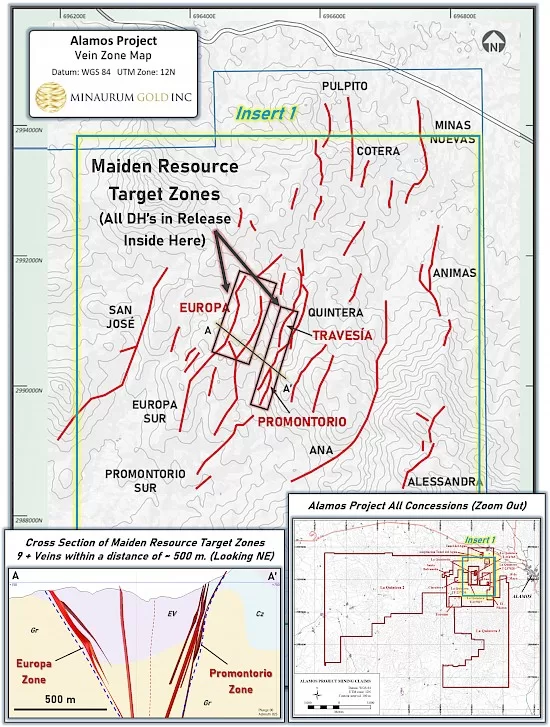 SONORA, MÉXICO – Minaurum Gold Inc. (“Minaurum”) (TSXV:MGG) (OTCQX:MMRGF) anunció los resultados iniciales de su programa de perforación de definición de recursos 2025, dirigido a las zonas de vetas Promontorio, Europa y Travesia en su Proyecto de Plata Álamos (“Álamos”) en Sonora, México. Estas zonas de vetas han arrojado numerosas intersecciones de alta ley, incluyendo las detalladas en la Tabla 1 y Figuras 1-3.