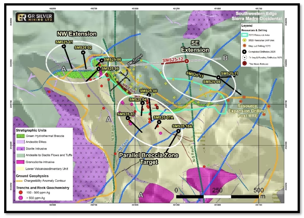 Vancouver, BC – GR Silver Mining Ltd. anunció resultados significativos del barreno SMS25-12, el cual extendió la mineralización aproximadamente 75 metros por debajo del actual recurso del Área San Marcial, dentro del Proyecto Plomosas. La perforación identificó dos zonas mineralizadas con múltiples intervalos de plata de alta ley, reforzando el potencial de ampliar el recurso y demostrando que el sistema permanece abierto en profundidad.