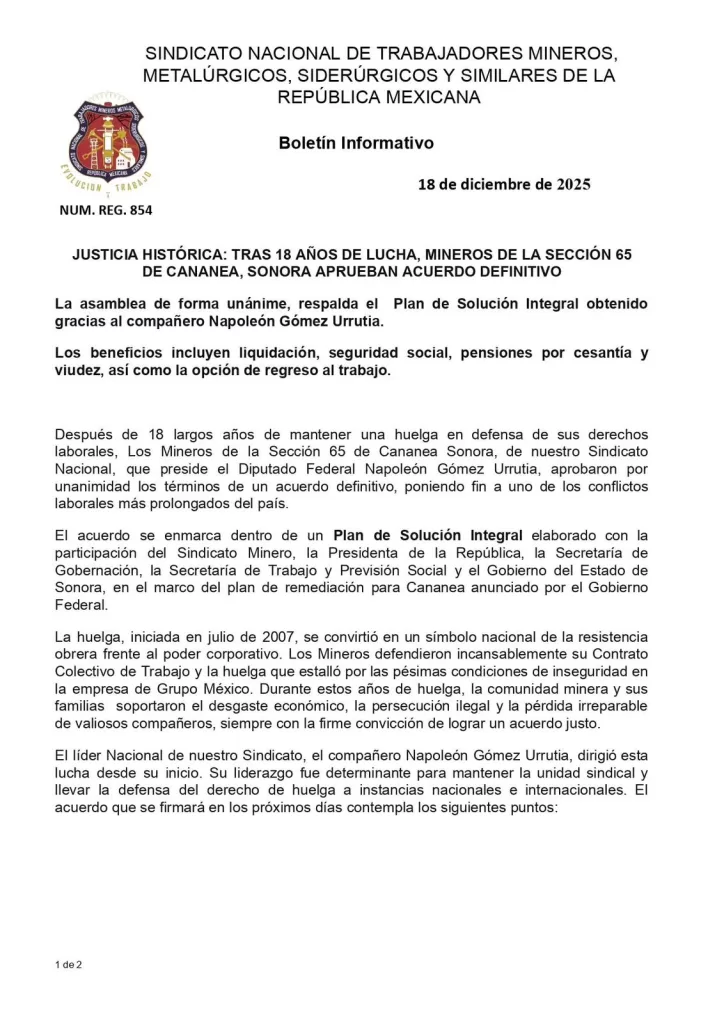 Cananea, Sonora.— Luego de 18 años de una de las huelgas más prolongadas y emblemáticas del país, los mineros de la Sección 65 de Cananea aprobaron por unanimidad un acuerdo definitivo que pone fin al conflicto laboral iniciado en julio de 2007. La decisión fue tomada en asamblea general, donde se respaldó el Plan de Solución Integral alcanzado con la participación del Sindicato Nacional Minero y autoridades federales y estatales.
