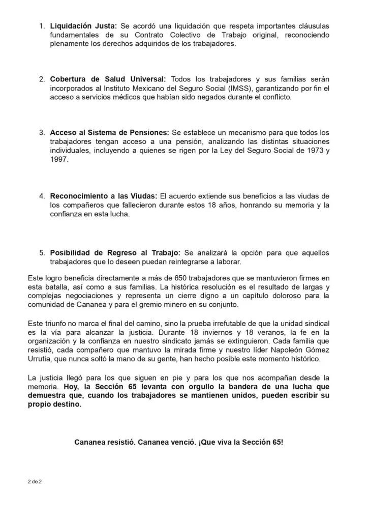 Por otra parte, Gómez Urrutia publico en sus redes sociales: “¡Cananea resistió y venció! Tras 18 años de una dura batalla se logró una resolución, en la cual, la asamblea respaldó de forma unánime el Plan de Solución Integral, que incluye: liquidación, seguridad social, pensiones por cesantía y viudez, así como la opción de regreso al trabajo. Este triunfo es la prueba irrefutable de que la unidad y la fuerza de nuestro gran Sindicato Minero “Los Mineros” pueden cambiar la realidad de la clase trabajadora. Sigamos avanzando con la frente en alto, y luchando hasta que la dignidad y la justicia sean una realidad.”