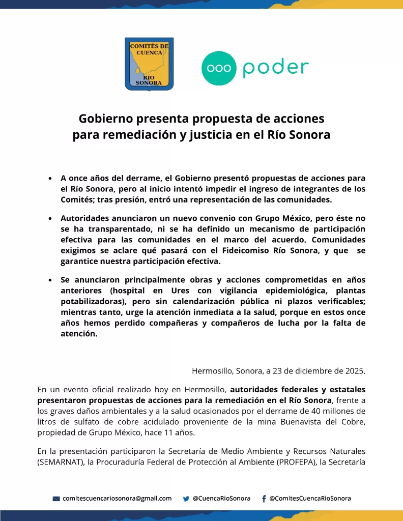 Desde los Comités de Cuenca Río Sonora y la organización PODER, se reconoció que el anuncio representa un cambio en la forma en que el Estado mexicano ha abordado el caso. Sin embargo, advirtieron que persisten vacíos estructurales que deben atenderse de manera inmediata y con participación plena de las comunidades afectadas.