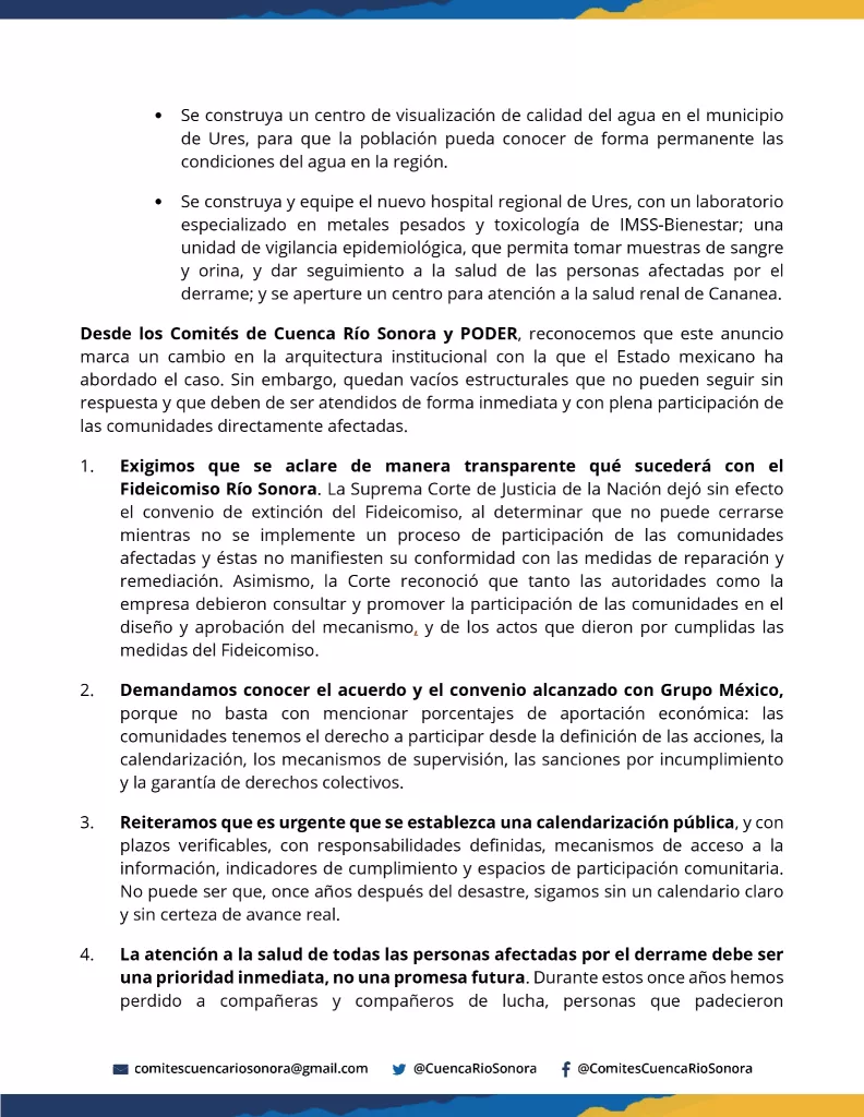 Entre sus principales exigencias se encuentra la aclaración pública y transparente sobre el futuro del Fideicomiso Río Sonora, cuya extinción fue invalidada por la Suprema Corte de Justicia de la Nación, al determinar que no puede cerrarse sin un proceso de participación comunitaria y sin la conformidad de las personas afectadas respecto a las medidas de reparación.