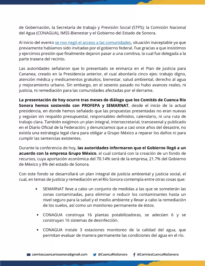 La presentación ocurre después de meses de diálogo entre los Comités de Cuenca Río Sonora, SEMARNAT y PROFEPA, en los que —según las comunidades— se advirtió que las propuestas no eran nuevas, carecían de respaldo presupuestal, responsables definidos, calendario público y una ruta clara de implementación. También denunciaron que, a casi once años del desastre, no existía una estrategia legal contundente para obligar a Grupo México, propietario de la mina Buenavista del Cobre, a reparar los daños ni para cumplir las sentencias existentes.