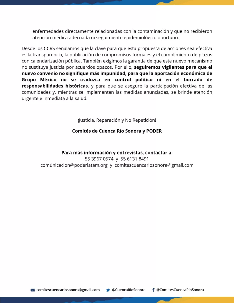 Las comunidades advirtieron que se mantendrán vigilantes para evitar que el nuevo acuerdo derive en opacidad o impunidad, y exigieron que la justicia ambiental y social en el Río Sonora se construya con transparencia, cumplimiento de plazos y participación efectiva de quienes han sufrido directamente las consecuencias del desastre.