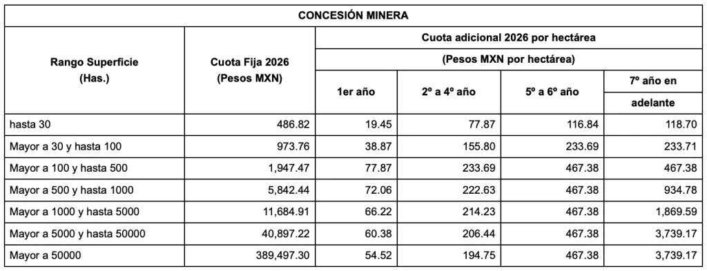 La actualización será válida del 1 de enero al 31 de diciembre de 2026, periodo durante el cual las concesiones mineras deberán cumplir con los montos establecidos.
