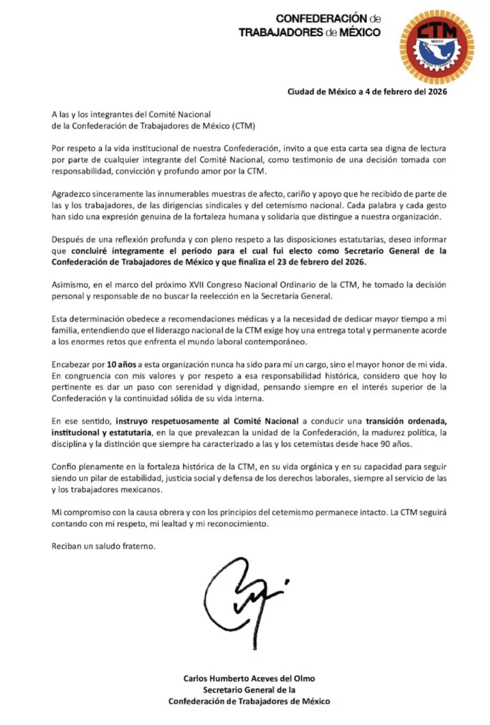Carlos Aceves del Olmo, secretario general de la Confederación de Trabajadores de México (CTM), anunció que concluirá su periodo en febrero de 2026 y no buscará la reelección, en apego a los estatutos y por motivos de salud y familiares.