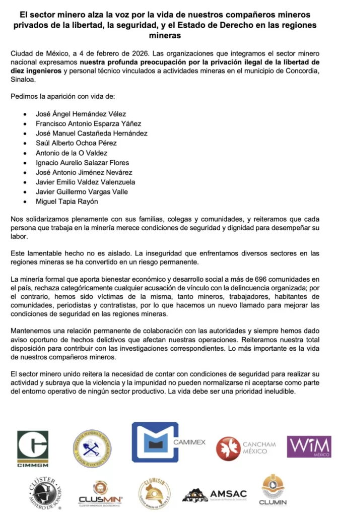 Concordia, Sinaloa.— Organizaciones que integran el sector minero nacional expresaron su profunda preocupación y condena por la privación ilegal de la libertad de diez ingenieros y personal técnico vinculados a actividades mineras en el municipio de Concordia, Sinaloa, y exigieron a las autoridades acciones urgentes para su localización, así como el fortalecimiento de la seguridad y el Estado de Derecho en las regiones mineras del país.