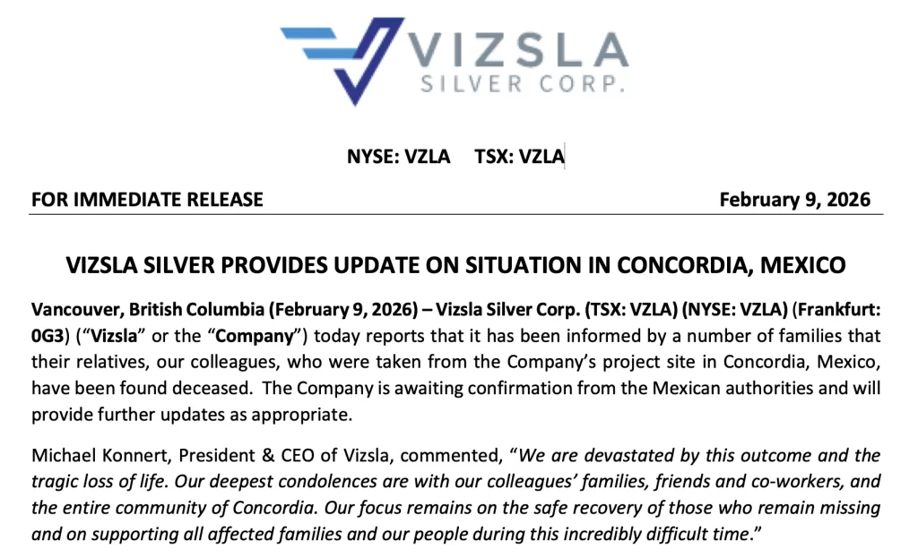 Concordia, Sinaloa / Vancouver, Canadá, 9 de febrero de 2026.— La empresa canadiense Vizsla Silver Corp. informó este lunes que fue notificada por familiares de trabajadores mineros sobre el hallazgo sin vida de algunos de sus colaboradores que habían sido privados de la libertad en el municipio de Concordia, Sinaloa, el pasado 23 de enero.