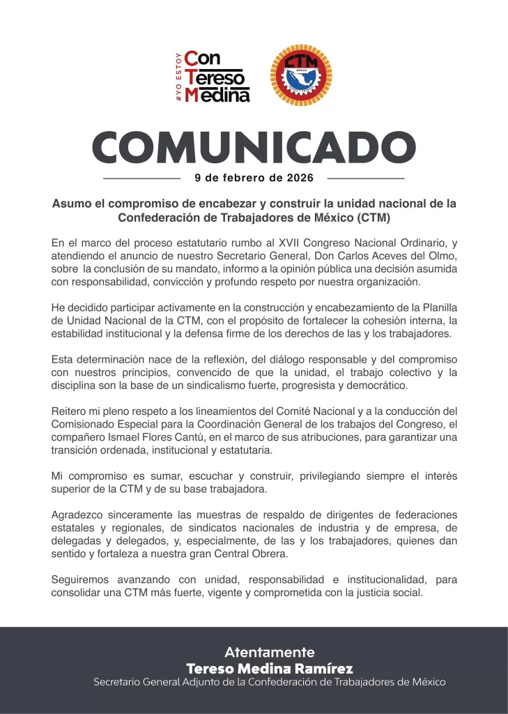 Ciudad de México.— En el marco del proceso estatutario rumbo al XVII Congreso Nacional Ordinario de la Confederación de Trabajadores de México (CTM), Tereso Medina Ramírez anunció su decisión de participar activamente en la conformación y encabezamiento de una Planilla de Unidad Nacional, en un momento clave para la vida interna de la central obrera.