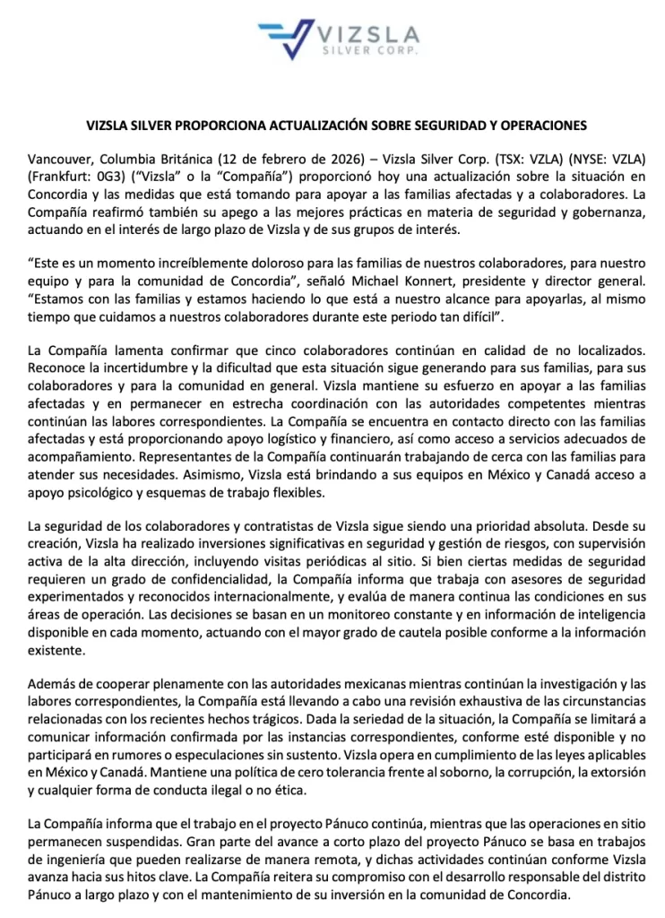 Vancouver, Columbia Británica, 12 de febrero de 2026.– Vizsla Silver Corp. (TSX: VZLA) (NYSE: VZLA) (Frankfurt: 0G3) informó una actualización sobre la situación de seguridad en Concordia, Sinaloa, y las medidas que implementa para apoyar a las familias afectadas y a sus colaboradores, tras los recientes hechos de violencia en la región.