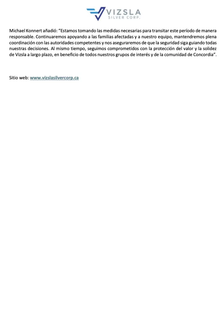“Este es un momento increíblemente doloroso para las familias de nuestros colaboradores, para nuestro equipo y para la comunidad de Concordia”, señaló Michael Konnert, presidente y director general de Vizsla Silver. “Estamos con las familias y estamos haciendo lo que está a nuestro alcance para apoyarlas, al mismo tiempo que cuidamos a nuestros colaboradores durante este periodo tan difícil”.