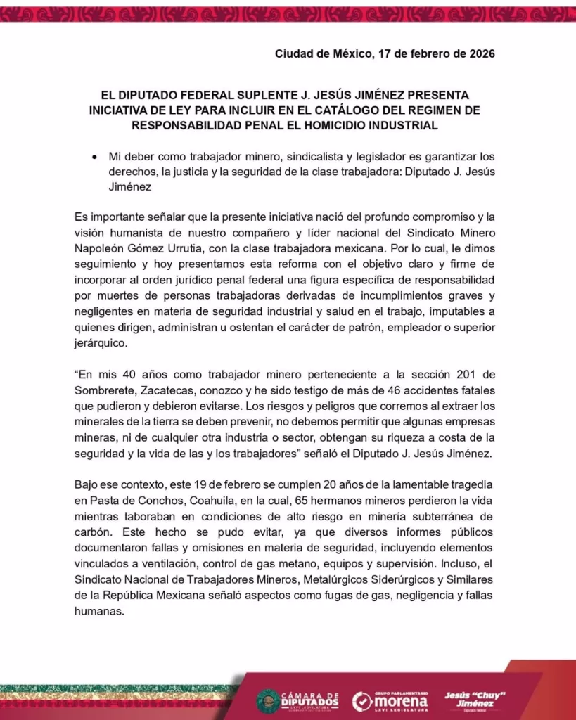 En el marco del 20 aniversario de la explosión ocurrida en la mina Pasta de Conchos, donde fallecieron 65 trabajadores el 19 de febrero de 2006, el diputado J. Jesús Jiménez presentó una iniciativa ante la Cámara de Diputados para reformar el Código Penal Federal y garantizar la seguridad laboral en las industrias del país.