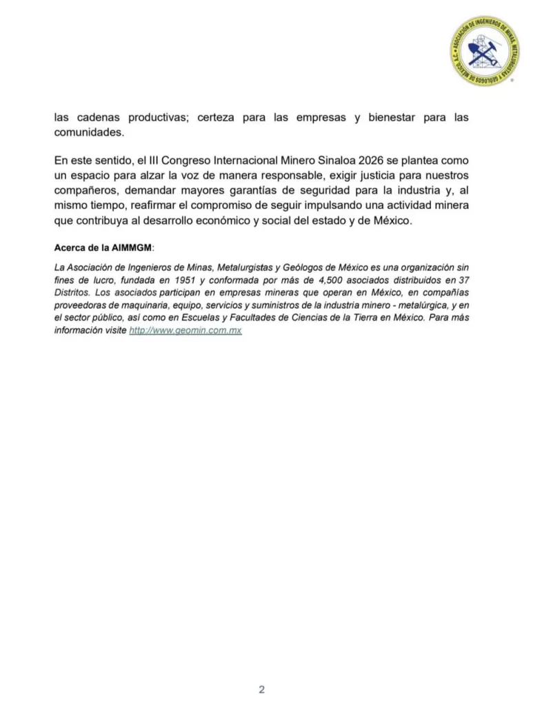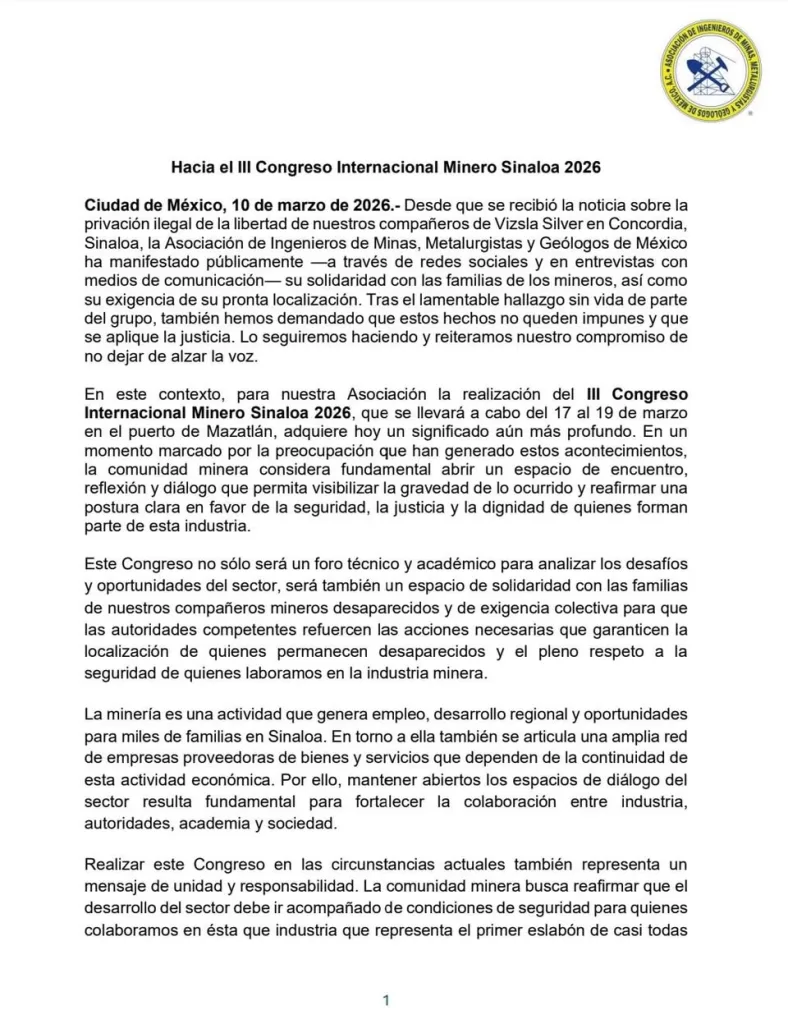 Ciudad de México, 10 de marzo de 2026. La Asociación de Ingenieros de Minas, Metalurgistas y Geólogos de Méxicoreiteró su solidaridad con las familias de los trabajadores de la empresa Vizsla Silver que fueron víctimas de privación ilegal de la libertad en el municipio de Concordia, en el estado de Sinaloa.